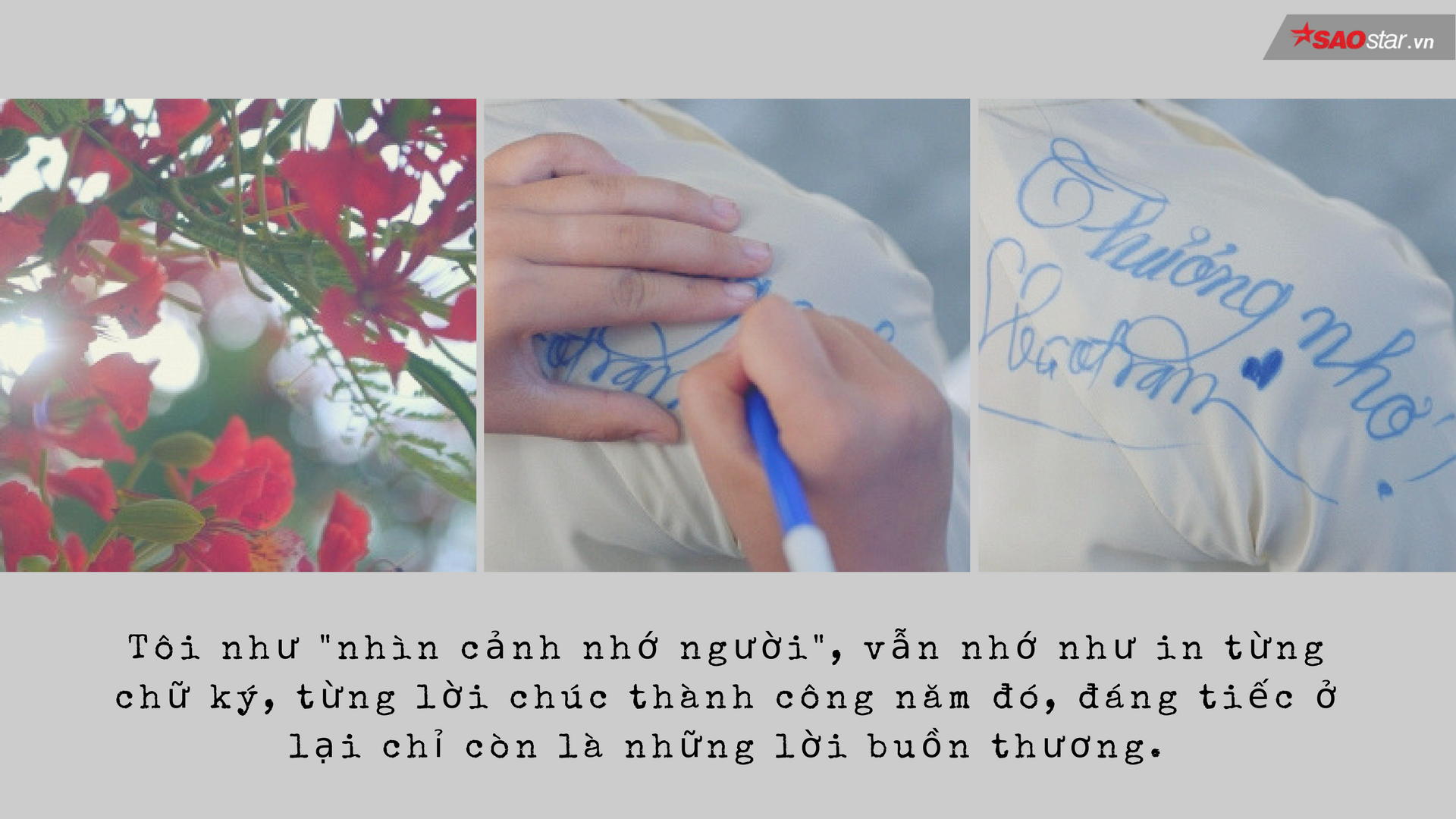 “Ai thương ai quen ai giận hờn. Buồn cánh phượng rơi khi ta chờ người không tới. Cho hôm nay miên man bồi hồi. Nhặt lá vàng mơ khi xưa một mối tình thơ.”