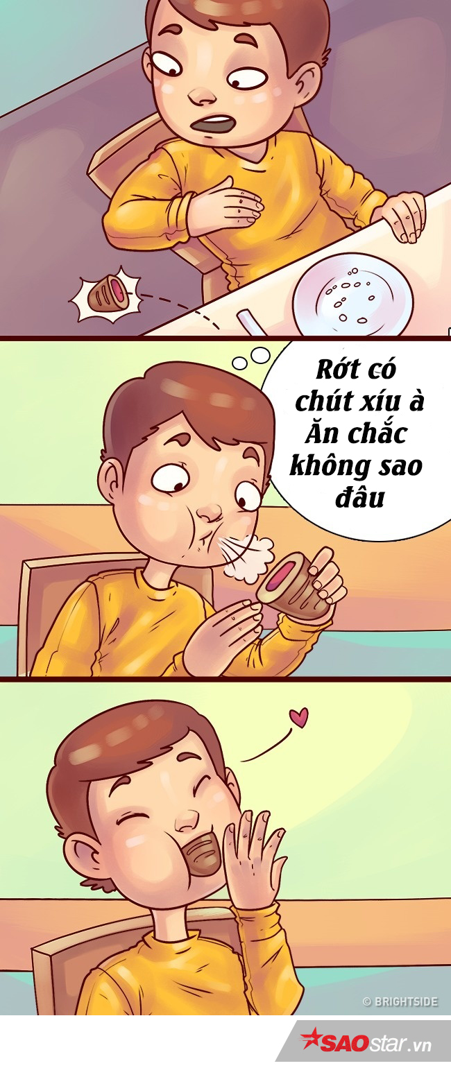 Tiếc gần chết khi lỡ làm rơi đồ ăn, mà thôi kệ không sao phủi đi ăn lại vẫn còn ngon mà.