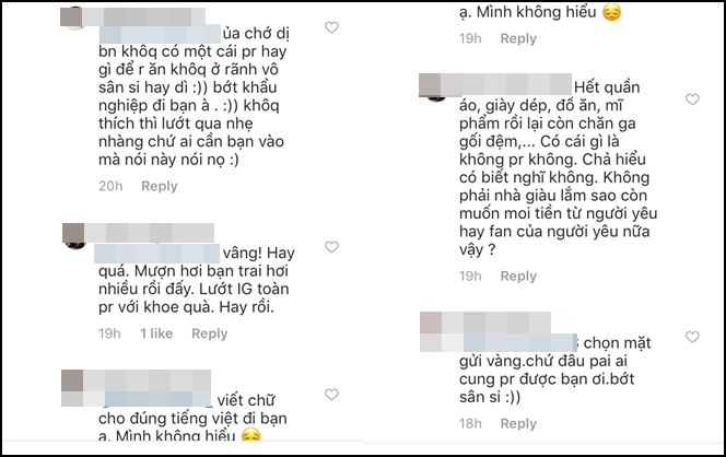 Mới đây dưới một tấm hình Quỳnh Anh đăng quảng cáo cho một phần mềm chỉnh ảnh, một fan vào “xéo xắt”: “Lại PR, mượn hơi bạn trai hơi nhiều rồi đấy. Toàn thấy PR với khoe quà, hết quần áo, giày dép, đồ ăn, mĩ phẩm rồi lại còn chăn ga gối đệm… có cái gì là không PR không. Không phải nhà giàu lắm sao còn moi tiền từ người yêu hay fan của người yêu nữa”.