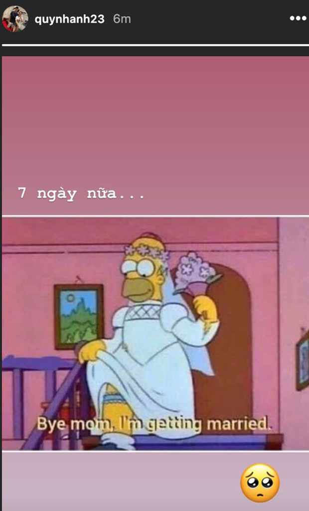 Bằng chứng là mới đây, trên trang cá nhân, Quỳnh Anh đã đếm ngược ngày ăn hỏi, phía dưới là bức ảnh minh họa cô dâu cầm hoa bước ra khỏi nhà kèm dòng chú thích: “Bye mom, I’m getting married” (Tạm dịch: Tạm biệt mẹ, con đi lấy chồng).