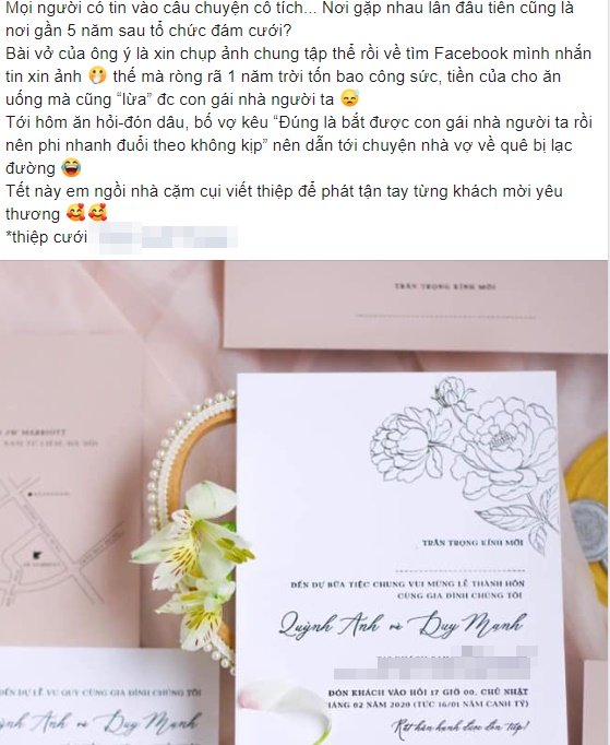 Vừa qua, bạn gái Duy Mạnh đã đăng tải ảnh thiệp cưới của mình kèm những lời tâm sự trước khi kết hôn. Trên trang cá nhân, Quỳnh Anh viết: “Mọi người có tin vào câu chuyện cổ tích, nơi gặp nhau lần đầu tiên cũng là nơi gần 5 năm sau tổ chức đám cưới.