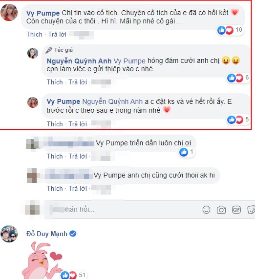 Bài đăng trên thu hút hàng chục nghìn lượt thích của cư dân mạng. Đặc biệt, Vy Nguyễn, bạn gái Mạc Văn Khoa cũng bình luận dưới bài viết. Cô chia sẻ: “Chị tin vào cổ tích. Chuyện cổ tích của em đã có hồi kết. Còn chuyện của chị thôi. Mãi hạnh phúc nhé cô gái”.