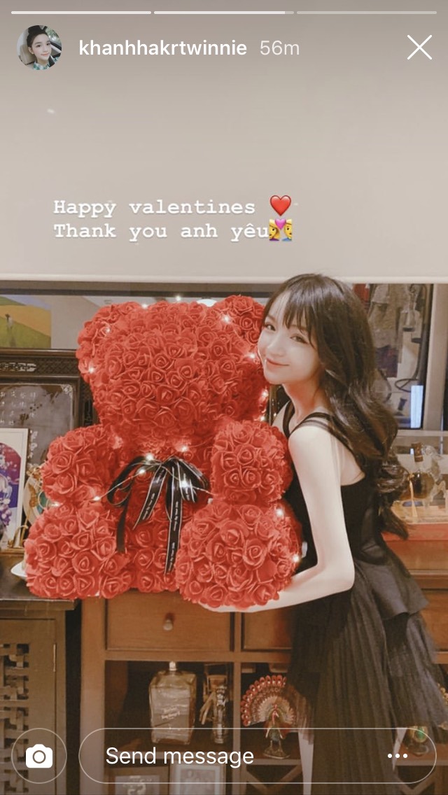 Đến gần cuối ngày Valentine, Khánh Hà mới khoe bức ảnh chụp với món quà do bạn trai tặng. Đó là một chú gấu được kết từ hàng trăm bông hoa hồng. Chú gấu hoa này đẹp đã là một nhẽ nhưng nhan sắc tựa búp bê của bạn gái Phan Hoàng mới chính là điểm nhấn của bức hình.
