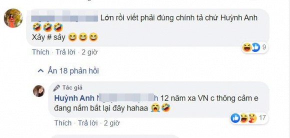 Phía dưới bình luận, một số cư dân mạng nhắc nhở Huỳnh Anh việc viết sai chính tả, cụ thể là “xảy ra” chứ không phải “sảy ra”. Trước những phản ứng của dân tình, Huỳnh Anh nhanh chóng sửa lại bài viết kèm lời giải thích: “12 năm xa Việt Nam, chị thông cảm em đang nắm bắt lại đây, haha”. Thái độ ôn hòa cùng lý do thuyết phục của Huỳnh Anh đã lập tức ghi được điểm cộng đối với cộng đồng mạng.