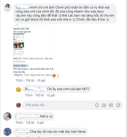 “Mình chỉ comment ảnh Chinh phủ nhận tin đồn có người yêu thôi mà cũng xóa comment của mình. Tốc độ xóa cũng nhanh như xóa story vậy. Em này cũng đáo để thật, thôi các bạn vào tâng bốc đi cho em nó vui. Giờ block rồi khỏi xóa comment nhé em, Chinh vẫn kêu ế kìa!“, một nickname bình luận.