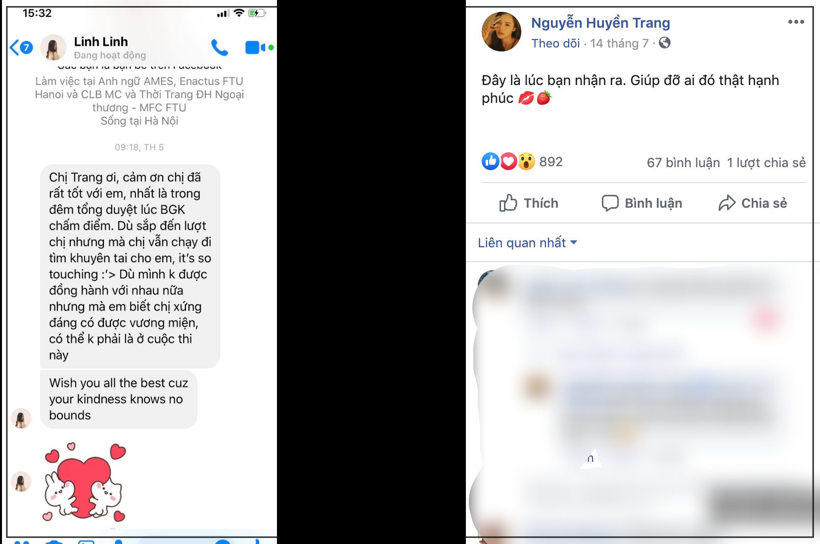 Có thể thấy, dù không thành công trong cuộc thi, nhưng Huyền Trang đã để lại ấn tượng là một đàn chị tốt bụng, hết mình vì đàn em. Vì vậy, cô rất vui mừng khi cô em gái mà cô quan tâm ngày nào trong cuộc thi giờ đã đoạt được vương miện danh giá nhất.