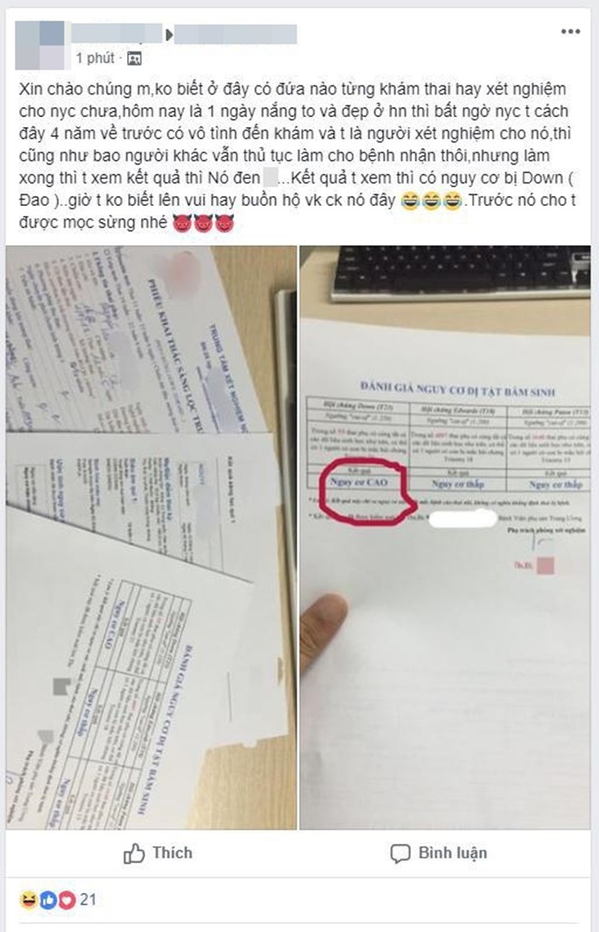 “Xin chào mọi người. Không biết ở đây có ai từng khám thai hay xét nghiệm cho người yêu cũ chưa. Hôm nay là một ngày nắng to và đẹp ở Hà Nội thì bất ngờ người yêu cũ tôi cách đây 4 năm về trước có vô tình đến khám và tôi là người xét nghiệm cho cô ấy. Cũng như bao người khác, tôi vẫn làm thủ tục cho bệnh nhân bình thường thôi. Nhưng xong tôi xem kết quả thì cô ấy xui xẻo, thai nhi có nguy cơ mắc hội chứng Down. Giờ tôi không biết nên vui hay buồn hộ vợ chồng cô ấy đây. Trước đây cô ấy cho tôi được “mọc sừng” nhé!”.