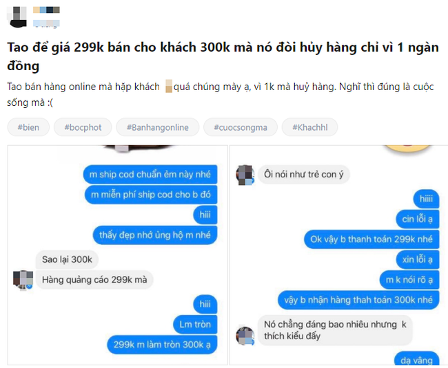 Mới đây nhất, tiếp tục kéo dài thêm những câu chuyện gây tranh cãi này, một shop bán hàng online đã lên mạng tố khách hàng báo hủy đơn chỉ vì lấy thêm 1 nghìn đồng. Cụ thể, chủ shop đăng tải dòng caption: “Mình để giá 299k bán cho khách 300k mà khách đòi hủy hàng chỉ vì 1 ngàn đồng. Mình bán hàng online mà gặp khách hãm quá các bạn ạ, vì 1 ngàn mà huỷ hàng. Nghĩ thì đúng là cuộc sống mà!”.