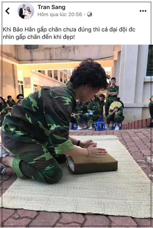 Tất tần tật những điều đó đã khiến dân tình cho rằng, Bảo Hân đi học quân sự như… đi chơi ấy nhỉ? Nhưng mới đây, bức ảnh cô nàng bị thầy giáo ”phạt” gấp chăn mền giữa sân trường đã khiến nhiều người ”tỉnh ngộ”, thừa nhận đi học quân sự rất vất vả và khốc liệt không thua gì học văn hoá đâu.