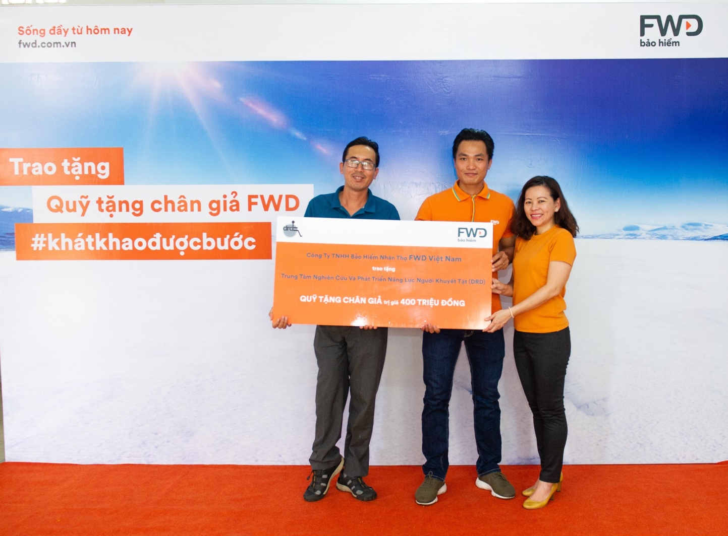 Bà Vương Mỹ Phụng - Phó Tổng Giám đốc Bộ phận Chiến lược Tiếp thị và Thương hiệu FWD Việt Nam và Phan Thanh Nhiên đã trao số tiền của Quỹ tặng chân giả cho đại diện Trung tâm Nghiên cứu và Phát triển năng lực người khuyết tật là ông Nguyễn Văn Cử - Phó Giám Đốc Trung tâm.