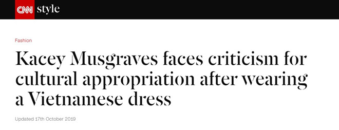 Tờ CNN (Mỹ) đã đăng tải vào ngày 17/10 vừa qua, bài viết với tiêu đề: Kacey Musgraves bị chỉ trích vì thiếu tôn trọng trang phục truyền thống của Việt Nam. Hãng tin có trụ sở tại Mỹ gọi hành động phản cảm của nữ ca sĩ là “chiếm dụng văn hóa Việt Nam”.