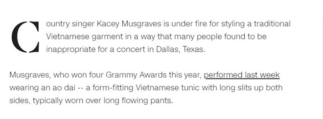 CNN viết: “Cô ấy đang bị chỉ trích vì cách mặc áo dài được cho là không phù hợp với truyền thống người Việt trong show diễn ở Dallas, Texas hồi tuần trước. Khi đó, Musgraves xuất hiện với bộ áo dài có đường cắt xẻ hai bên, nhưng trang phục này vốn được mặc cùng quần dài”