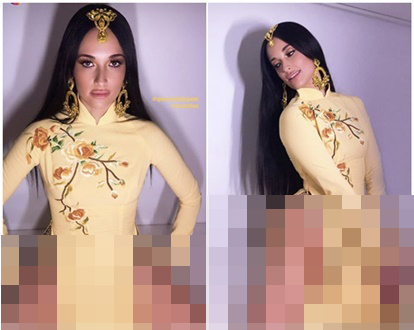 Hình ảnh tạo dáng phản cảm của nữ ca sĩ người Mỹ khi diện áo dài Việt Nam