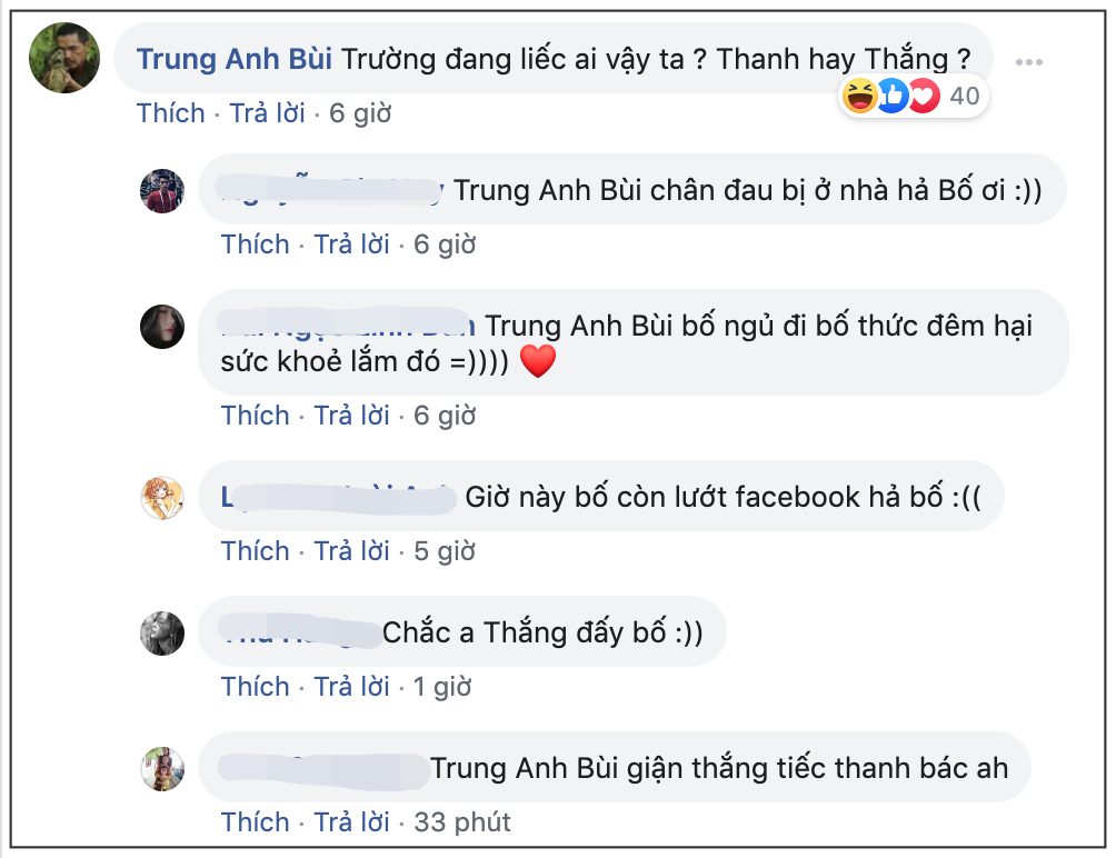 Bên dưới bức ảnh này, bố Sơn còn bình luận dí dỏm: ”Trường đang liếc ai vậy ta? Thanh hay Thắng?”.