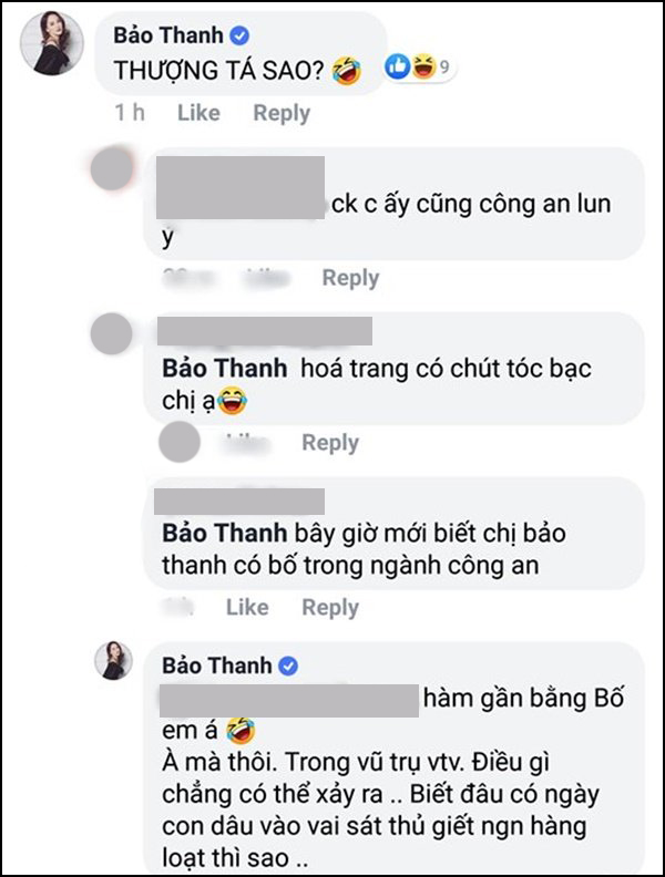 Cụ thể, khi bình luận về nhân vật Thông (Doãn Quốc Đam) - Thượng tá công an, Phó giám đốc cơ quan điều tra tỉnh Việt Thanh, Bảo Thanh tỏ ra bất ngờ vì cấp hàm Thượng tá của Thông. Thêm vào đó, nữ diễn viên còn tiết lộ: “Hàm gần bằng Bố em á. À mà thôi. Trong vũ trụ VTV điều gì chẳng có thể xảy ra… Biết đâu có ngày con dâu vào vai sát thủ giết người hàng loạt thì sao”.