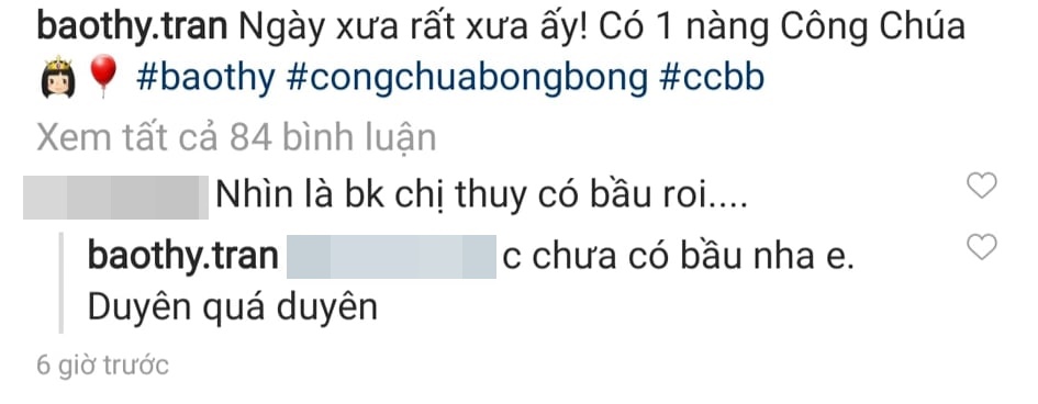 Mặc dù có thai là chuyện vui, nhưng trước sự suy đoán thiếu căn cứ của người này, Bảo Thy đã nhanh chóng đáp trả. Cô khẳng định vẫn chưa mang thai, đồng thời ngầm đá xoáy tài khoản mạng kém duyên: “Chị vẫn chưa có bầu nha em. Duyên quá duyên”. Nhiều người hâm mộ Bảo Thy cũng bức xúc và lên tiếng bênh vực Bảo Thy trước lời bình luận của tài khoản mạng trên.
