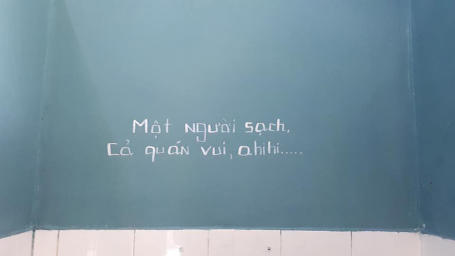 Theo đó, thay vì những lời nhắc nhở thông thường, chủ quán vui tính đã ghi trực tiếp lên tường những lời nhắn ngay ngắn, hóm hỉnh như: “Một người sạch, cả quán vui” hay “không dội - không về”… khiến nhiều người phì cười.