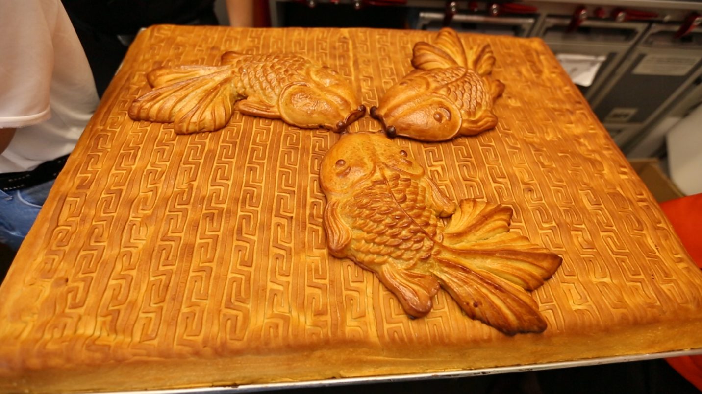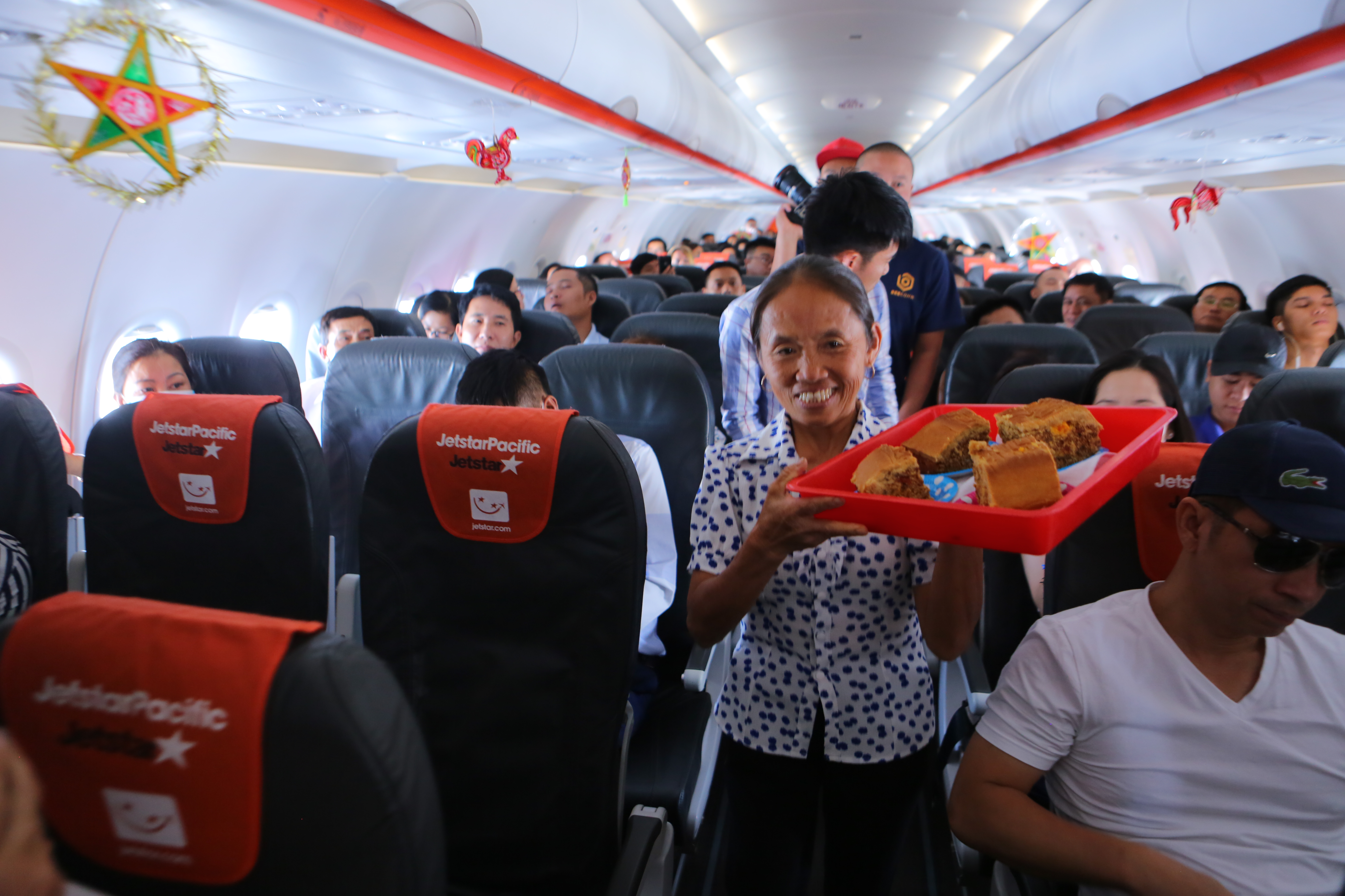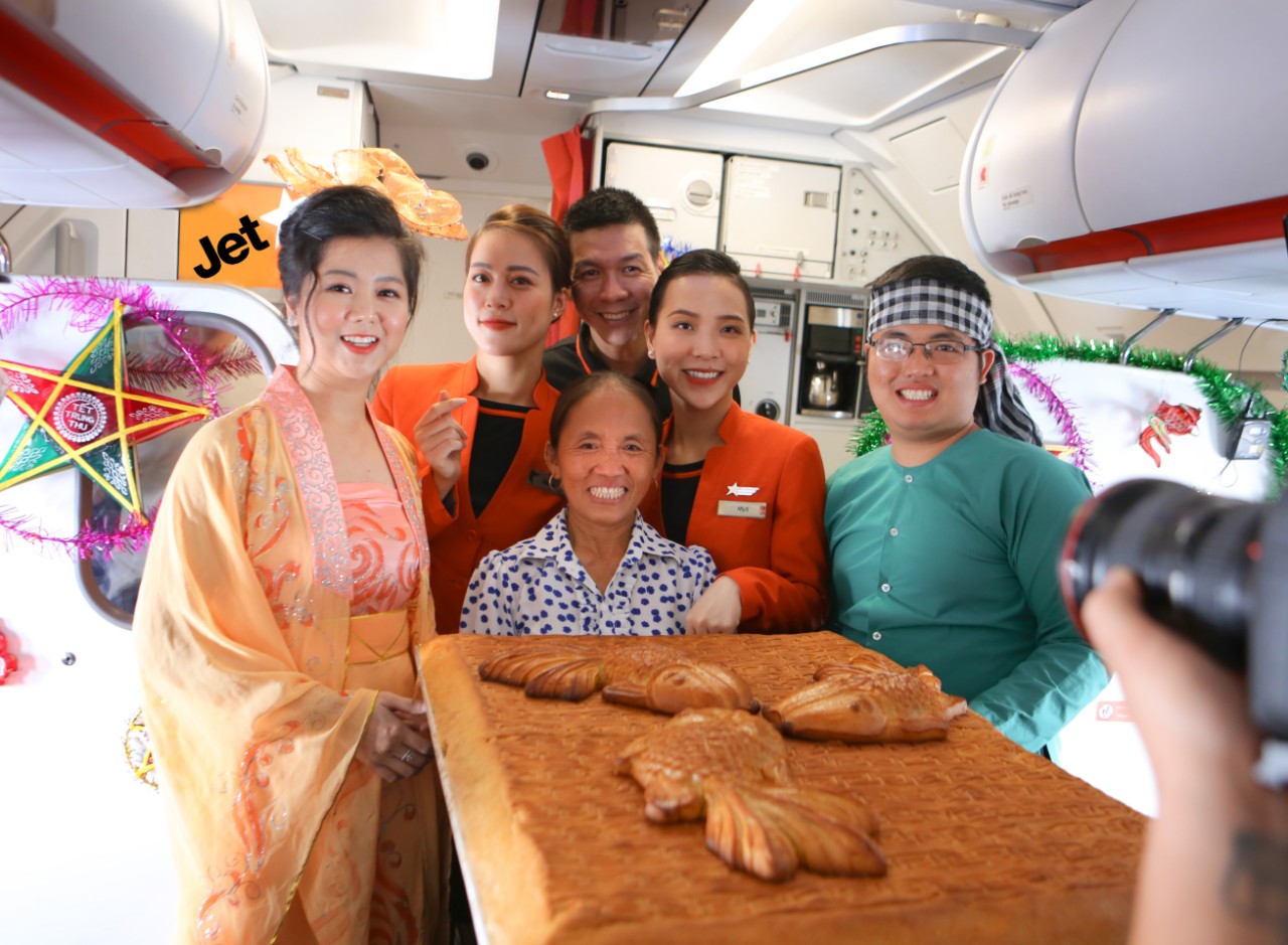 Cụ thể, trên chuyến bay Jetstar vào dịp Trung thu vừa rồi, hành khách không những được nhận quà từ chị Hằng, chú Cuội, mà còn được gặp một nhân vật đang rất được yêu thích trên mạng xã hội - bà Tân Vlog. Đặc biệt hơn, bà Tân Vlog còn mang cả một chiếc bánh trung thu siêu to khổng lồ lên chiêu đãi toàn bộ hành khách trên chuyến bay. Chiếc bánh nướng nhân thập cẩm to gần 1m2, nặng 60kg khiến nhiều hành khách thích thú.