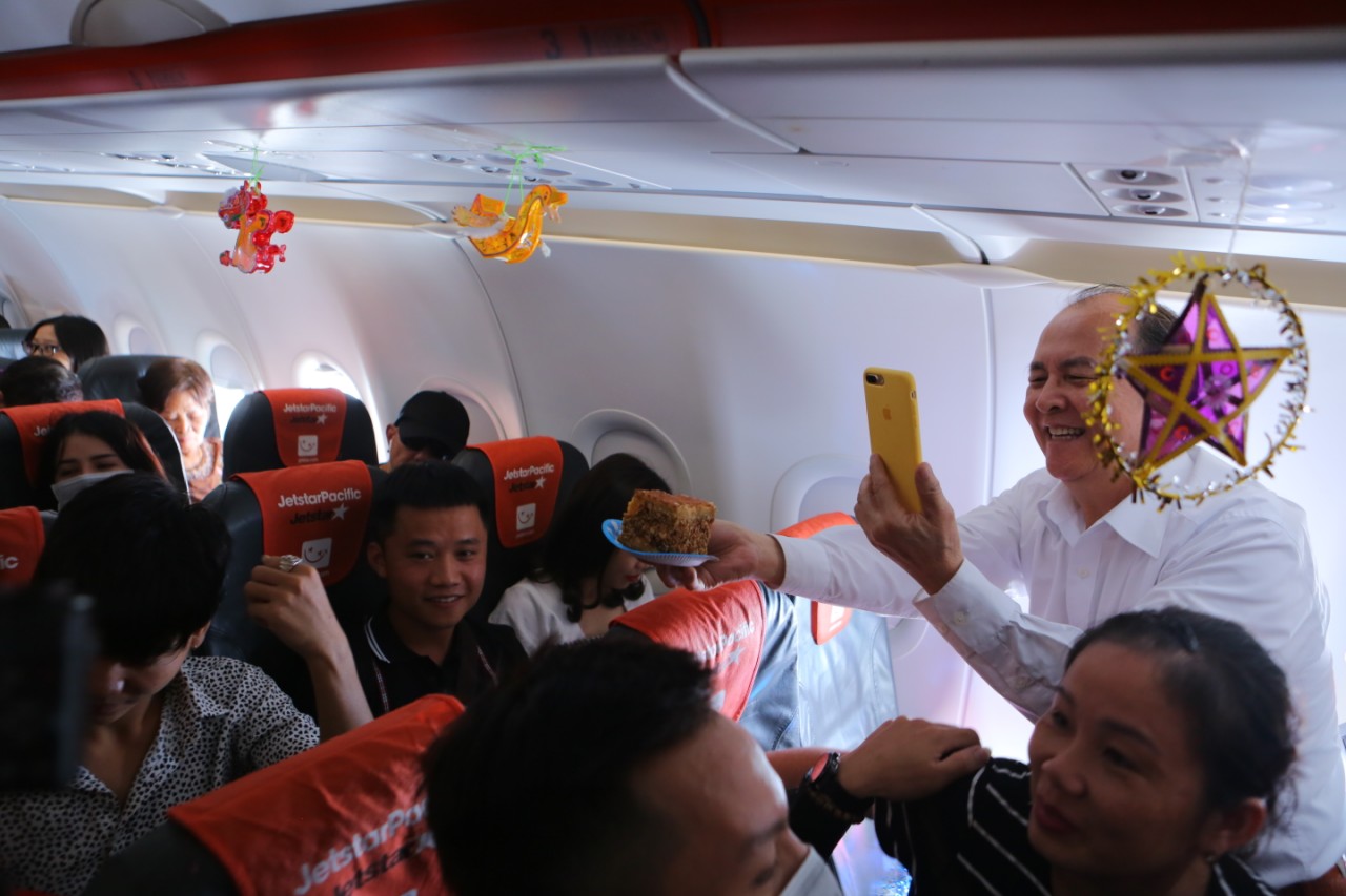 Chiếc bánh được bà Tân tự tay chuẩn bị kĩ lưỡng sẵn từ nhà, và được Hãng hàng không Jetstar hỗ trợ để mang lên máy bay chiêu đãi tạo sự bất ngờ thú vị cho các hành khách.
