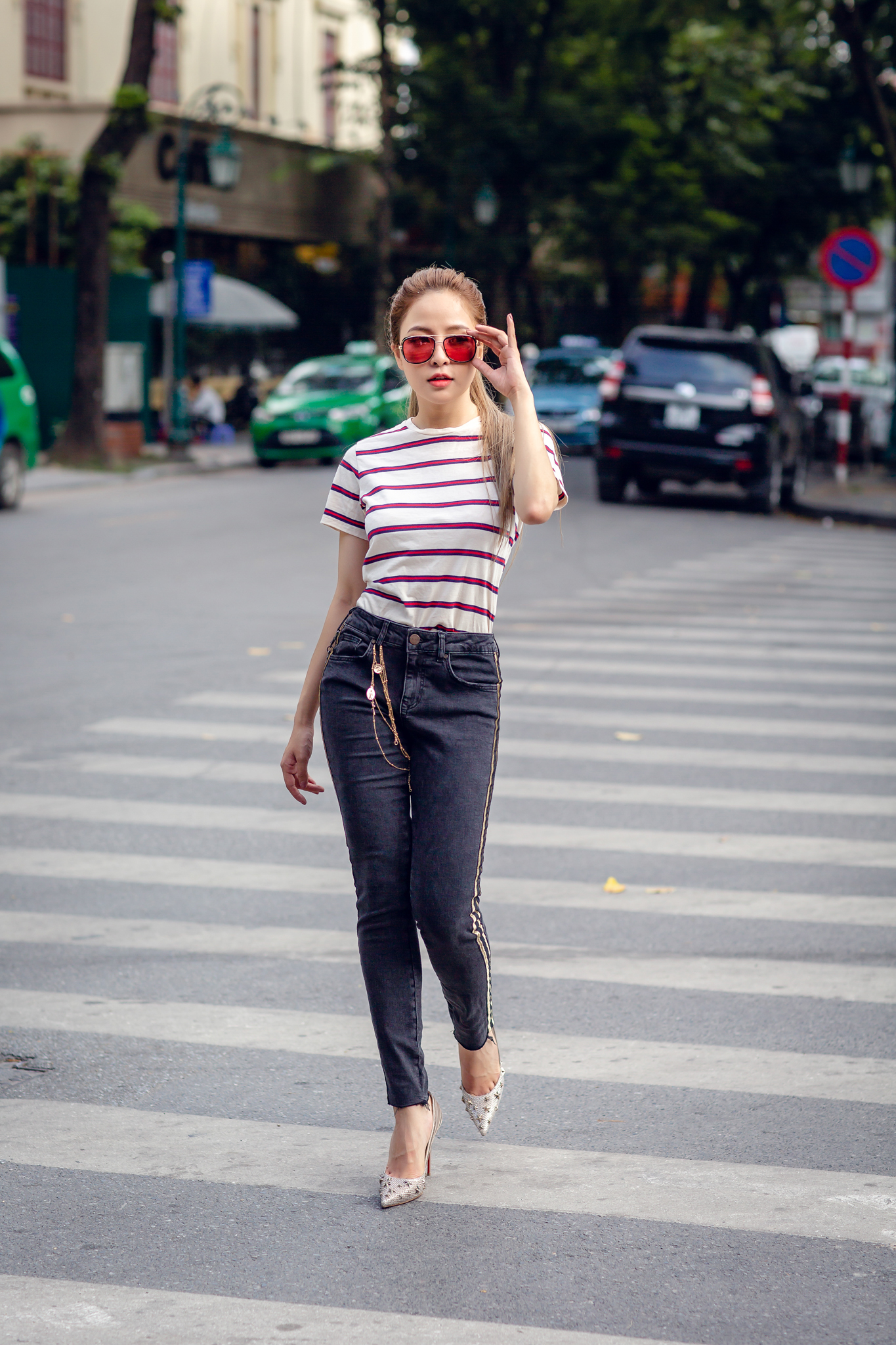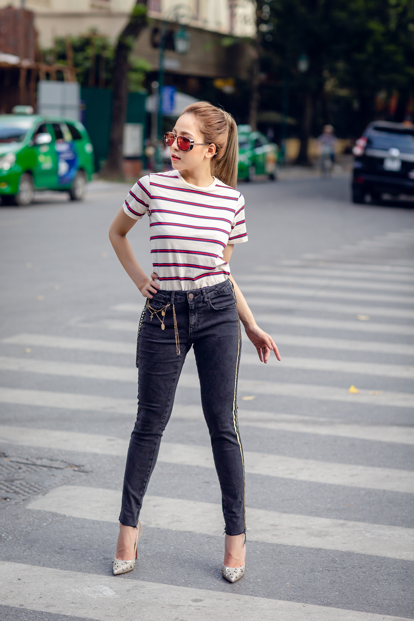 Dù chỉ chọn những item quen thuộc với giới trẻ như áo thun, quần jeans, chân váy jeans, jumpsuit denim… nhưng các món đồ này trở nên đắt giá hơn nhờ thắt lưng Moschino (12 triệu), túi belt bag Gucci (28 triệu) và những đôi giày hiệu của Louboutin, Gucci.