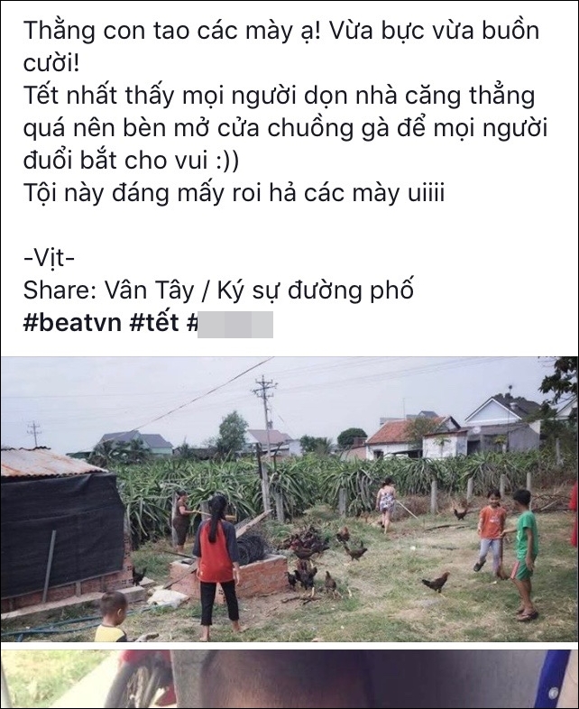 “Thằng con mình các bạn ạ. Vừa bực vừa buồn cười. Tết nhất thấy mọi người dọn nhà căng thẳng quá nên mở cửa chuồng gà để mọi người đuổi bắt cho vui. Tội này đáng mấy roi nhỉ mọi người”, dòng chia sẻ của V.T khiến nhiều người ôm bụng cười ngặt nghẽo.