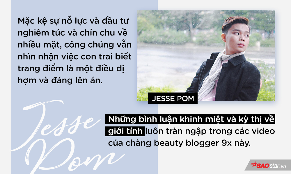 Đối với cộng đồng yêu thích làm đẹp, một nhân vật nam trở thành beauty blogger không còn là điều xa lạ vì những nhân vật có ảnh hưởng đến xu hướng làm đẹp, trang điểm trên thế giới hầu hết đều là đàn ông như JeffreeStar, Manny MUA, Bretman Rock, James Charles… Nhưng ở Việt Nam, khi xã hội còn nhiều định kiến, việc con trai như Jesse Pom lại rành rọt về trang điểm, dưỡng da thì chưa bao giờ là điều dễ chấp nhận cả.