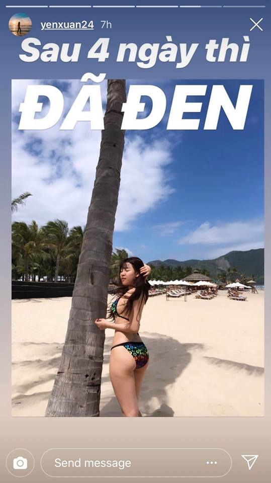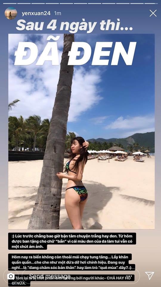 Trong ảnh, Yến Xuân viết: “Lúc trước chẳng bao giờ bận tâm chuyện trắng hay đen. Từ hôm được ban tặng cho chữ “bẩn” vì cái màu đen của làn da làm tôi vẫn có một chút ám ảnh. Hôm nay ra biển không còn thoải mái chạy tung tăng… Lấy khăn quấn quấn… che che như một đứa dở hơi chính hiệu. Đang suy nghĩ là chăm sóc bản thân hay làm trò quê mùa đây?