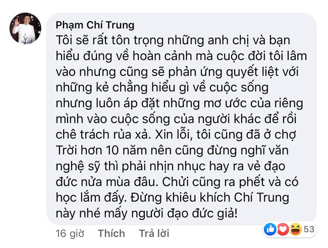Trước những nhận xét tiêu cực, chê bai, NSƯT Chí Trung đã có phản ứng cực “gắt”: “Tôi sẽ rất tôn trọng những anh chị và bạn hiểu đúng về hoàn cảnh mà cuộc đời tôi lâm vào nhưng cũng sẽ phản ứng quyết liệt với những kẻ chẳng hiểu gì về cuộc sống nhưng luôn áp đặt những mơ ước của riêng mình vào cuộc sống của người khác để rồi chê trách rủa xả. Xin lỗi, tôi cũng đã ở chợ Trời hơn 10 năm nên cũng đừng nghĩ văn nghệ sĩ thì phải nhịn nhục hay ra vẻ đạo đức nửa mùa đâu. Chửi cũng ra phết và có học lắm đấy. Đừng khiêu khích Chí Trung này nhé mấy người đạo đức giả!”.