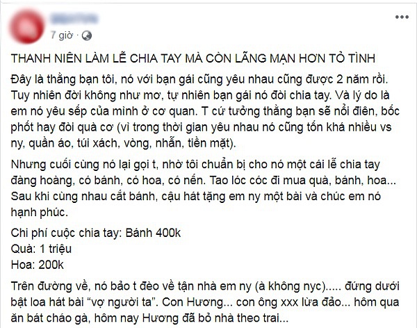 Bài đăng về nam thanh niên tổ chức ăn mừng sau khi chia tay người yêu nhận được sự quan tâm sâu sắc từ cộng đồng mạng. Cụ thể, sau hai năm yêu nhau đầy mặn nồng, cô bạn gái đã tìm được “mối khác tốt hơn” đó chính là sếp của cô. Quấ buồn bã, chàng trai đã chọn cách tổ chức tiệc chúc mừng cùng hội bạn thân. Hành động này đã được khen ngợi là ”chia tay văn minh”