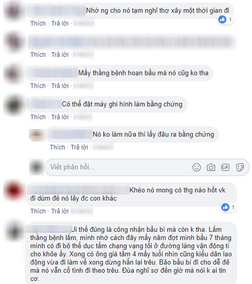 “Eo ôi, bây giờ nhiều thằng biến thái gu lạ lắm các chị ơi, tốt nhất là giữ mình thôi, đừng nghĩ bầu to, ăn mặc lòa xòa là an toàn đâu. Lúc trước em bầu 7 tháng, đi tập thể dục buổi sáng còn bị trêu cơ. Giờ chị không có bằng chứng gì cũng khó nói, cứ đề phòng, tránh mặt nó ra, lo giữ gìn sức khỏe mà sinh con. Riêng chồng chị em bó tay rồi, hèn hạ” - trích một bình luận gần như tương tự như trên của cô bạn Thanh Yên.