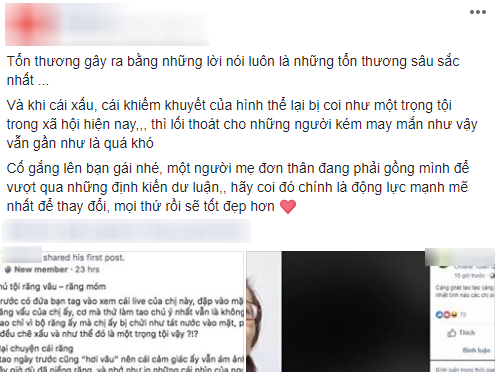 Trang fanpage xót xa viết như sau: “Tổn thương gây ra bằng những lời nói luôn là những tổn thương sâu sắc nhất. Và khi cái xấu, cái khiếm khuyết của hình thể lại bị coi như một trọng tội trong xã hội hiện nay, thì lối thoát cho những người kém may mắn như vậy vẫn gần như là quá khó. Cố gắng lên bạn gái nhé, một người mẹ đơn thân đang phải gồng mình để vượt qua những định kiến dư luận, hãy coi đó chính là động lực mạnh mẽ nhất để thay đổi, mọi thứ rồi sẽ tốt đẹp hơn”.