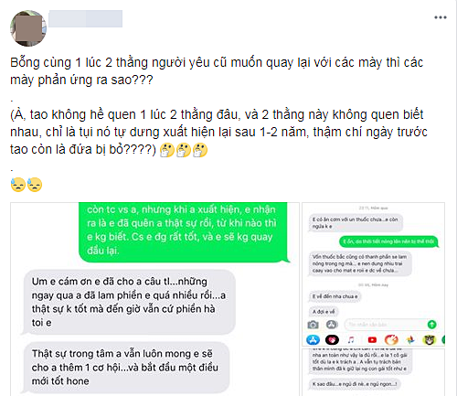 Mới mùng 2 đầu tháng đã gặp cảnh trớ trêu khi “tập thể” người yêu cũ muốn nối lại tình xưa cùng lúc, đến chính chủ T.N cũng phải khóc vì bối rối. Dù thương cảm cho cô gái xinh đẹp nhưng dân mạng vẫn bò lăn ra cười.