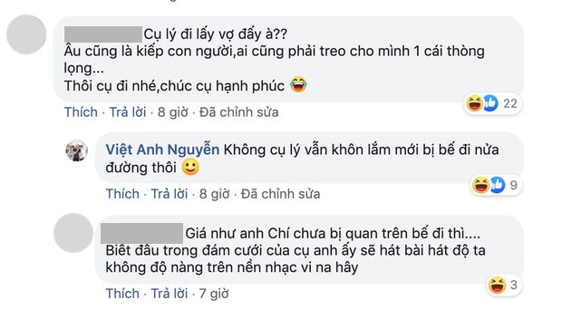 Thông qua phần bình luận này, ông Lý (Việt Anh) khẳng định mình không phải là chú rể và cũng không quên tự khen rằng mình “khôn lắm” nên mới bị “bế lên quan” có nửa đường thôi, chưa bị giam vào ngục (“Ngục” ở đây ám chỉ việc lập gia đình - PV).