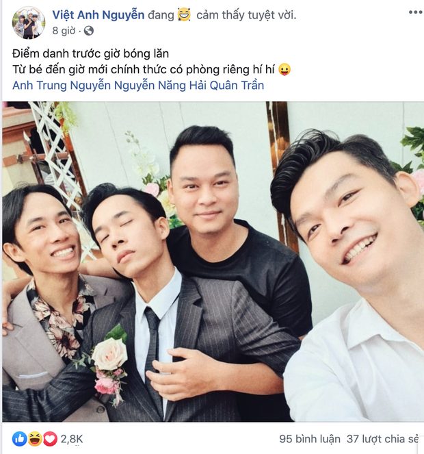 Không ngoài dự đoán, Việt Anh chính là người vui nhất khi Trung Anh lập gia đình. Không phải vì anh mình đã “tìm được bến đỗ” mà là vì cậu đã chính thức “tống” được anh ra khỏi nhà, một mình độc chiếm căn phòng từng là của chung. Trên trang cá nhân, Việt Anh viết: “Điểm danh trước giờ bóng lăn. Từ bé đến giờ mới được có phòng riêng, hí hí”.