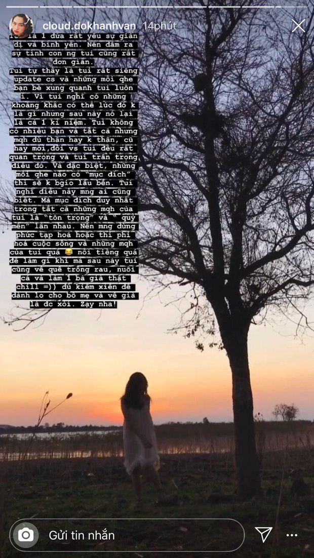 Cụ thể, Khánh Vân viết: “Tôi là một đứa yêu sự giản dị và bình yên nên đâm ra con người tôi cũng rất đơn giản. Tôi tự thấy là tôi rất siêng cập nhật cuộc sống và những mối quan hệ xung quanh vì tôi nghĩ có những khoảnh khắc có thể lúc đó không là gì nhưng sau này sẽ là kỷ niệm.