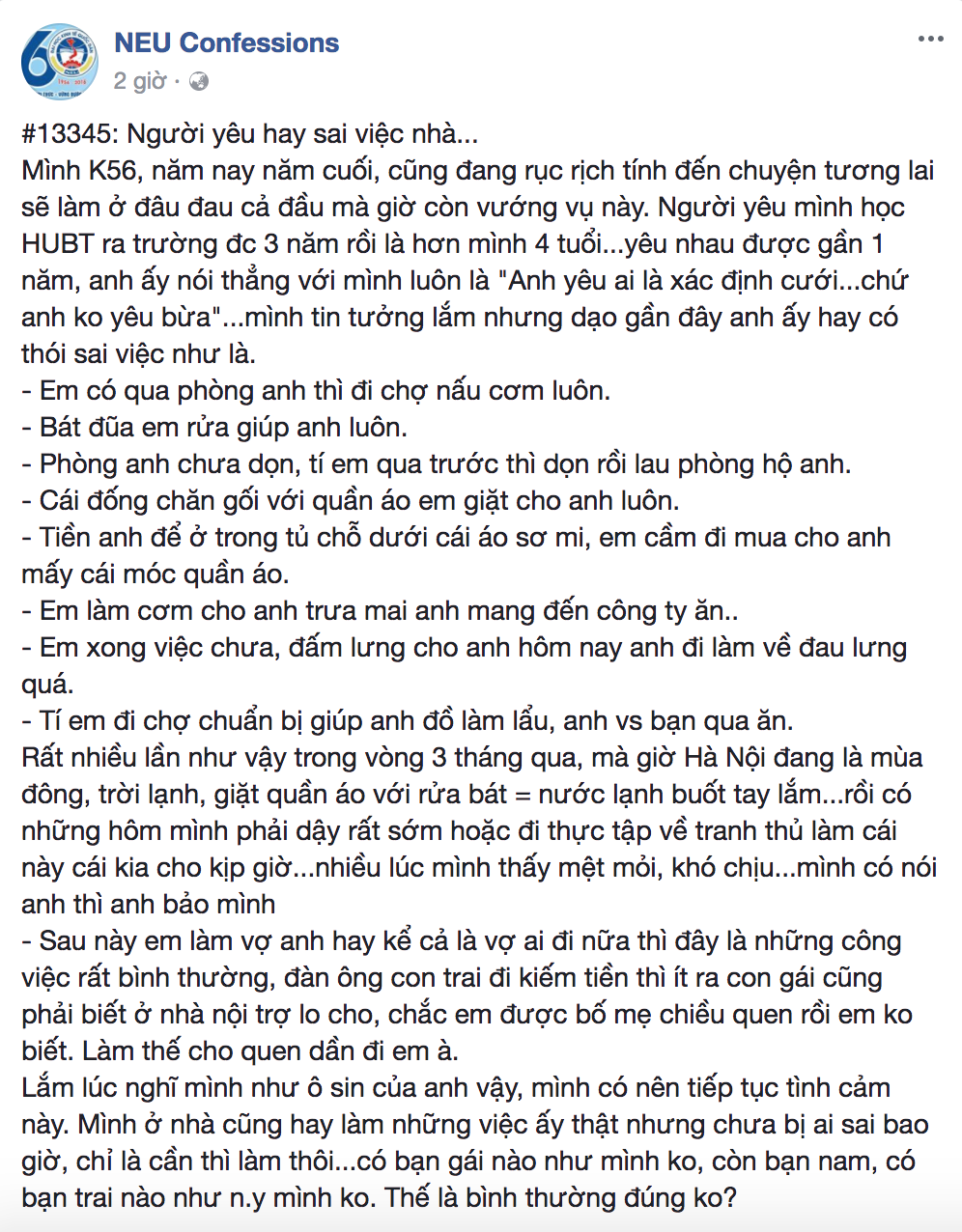 Khi yêu người ta có thể làm mọi thứ cho nhau mà không toan tính bất cứ điều gì, nhưng không phải trường hợp nào, sự hy sinh ấy cũng là xứng đáng. Giống như cô gái trong đoạn chia sẻ được đăng trên fanpgae NEU Confessions mới đây đã phải “tố” người yêu hay sai việc nhà, khi phản ứng lại thì bị nói là “tập làm dần cho quen”