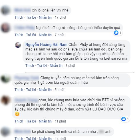 “Nghỉ luôn đi. Người công chúng mà thiếu duyên quá”; “Xin lỗi nhưng không phục, kiểu như mình không sai”; “Không phải chúng tôi mà là mình cá nhân anh”; “Tôi không thấy đây là lời xin lỗi mà là pha dằn mặt khán giả”; “Xin lỗi bằng cách nhắc lại lỗi của người khác, chân thành lắm!”... là một số ý kiến của khán giả sau lời chia sẻ trên sóng VTV của BLV Quốc Khánh mới đây.