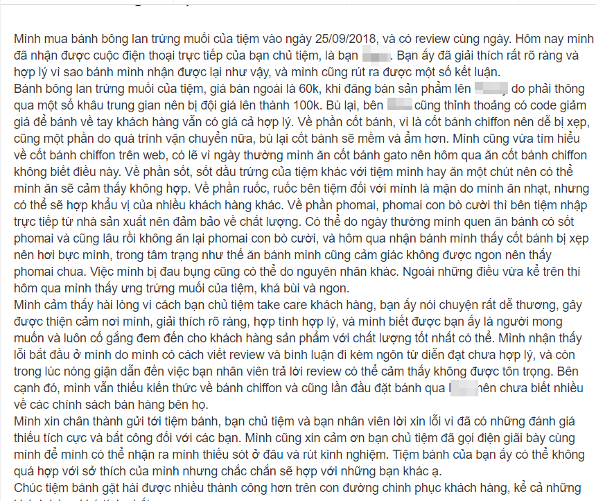 “Mình mua bánh bông lan trứng muối của tiệm vào ngày 25/09/2018, và có review cùng ngày. Hôm nay mình đã nhận được cuộc điện thoại trực tiếp của bạn chủ tiệm. Bạn ấy đã giải thích rất rõ ràng và hợp lý vì sao bánh mình nhận được lại như vậy, và mình cũng rút ra được một số kết luận. Bánh bông lan trứng muối của tiệm, giá bán ngoài là 60k, khi đăng bán sản phẩm lên do phải thông qua một số khâu trung gian nên bị đội giá lên thành 100k. Bù lại, bên đó cũng thỉnh thoảng có code giảm giá để bánh về tay khách hàng vẫn có giá cả hợp lý.