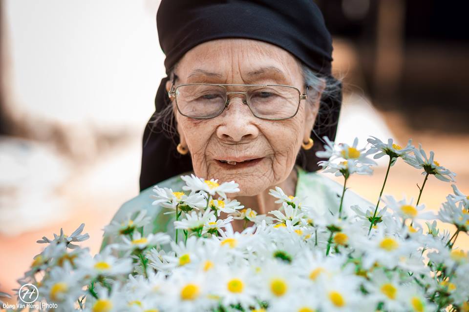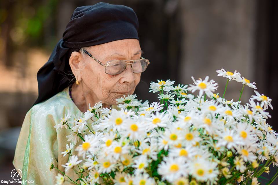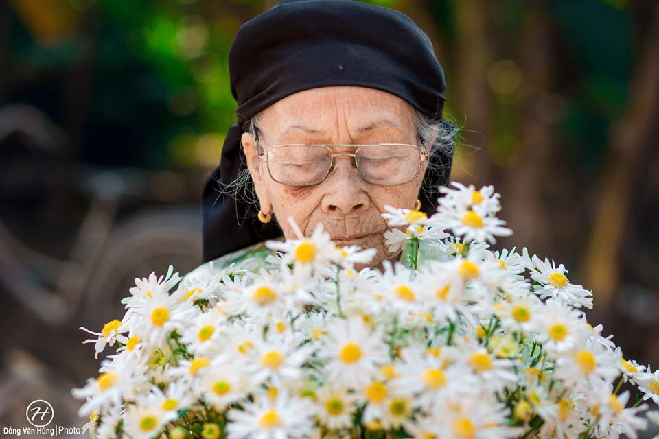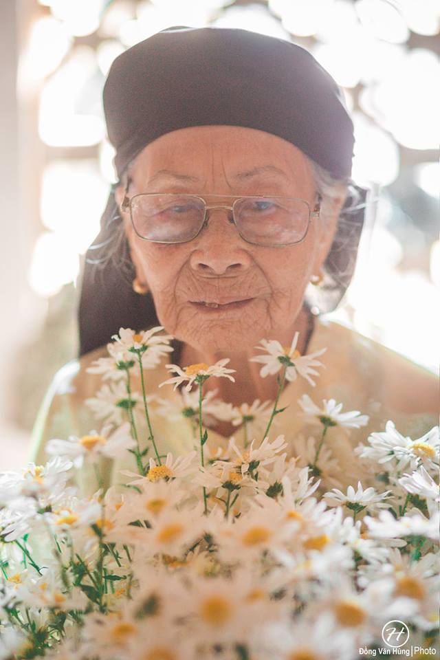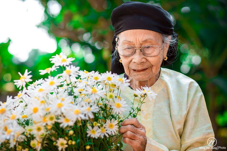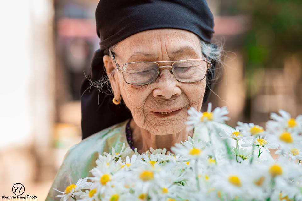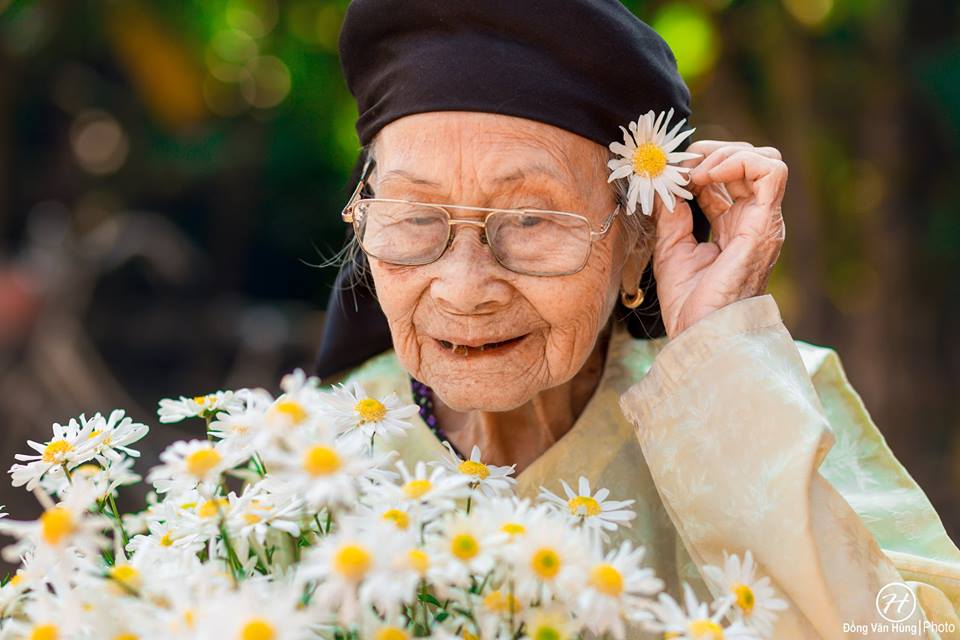 Hãy nhìn bà kìa! Dù đã cao tuổi nhưng gương mặt vẫn còn sáng bừng lắm, thần thái trên gương mặt khiến người ta nghĩ bà chỉ cỡ 70 tuổi là cùng. Không thua gì các người mẫu, bà cũng khá là biết ”diễn” và tạo dáng đấy nhé. Nhìn cách bà ”tận hưởng” bó hoa cúc họa mi trên tay, bất giác ai nấy cũng đều phải nở nụ cười.