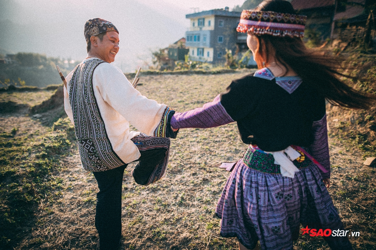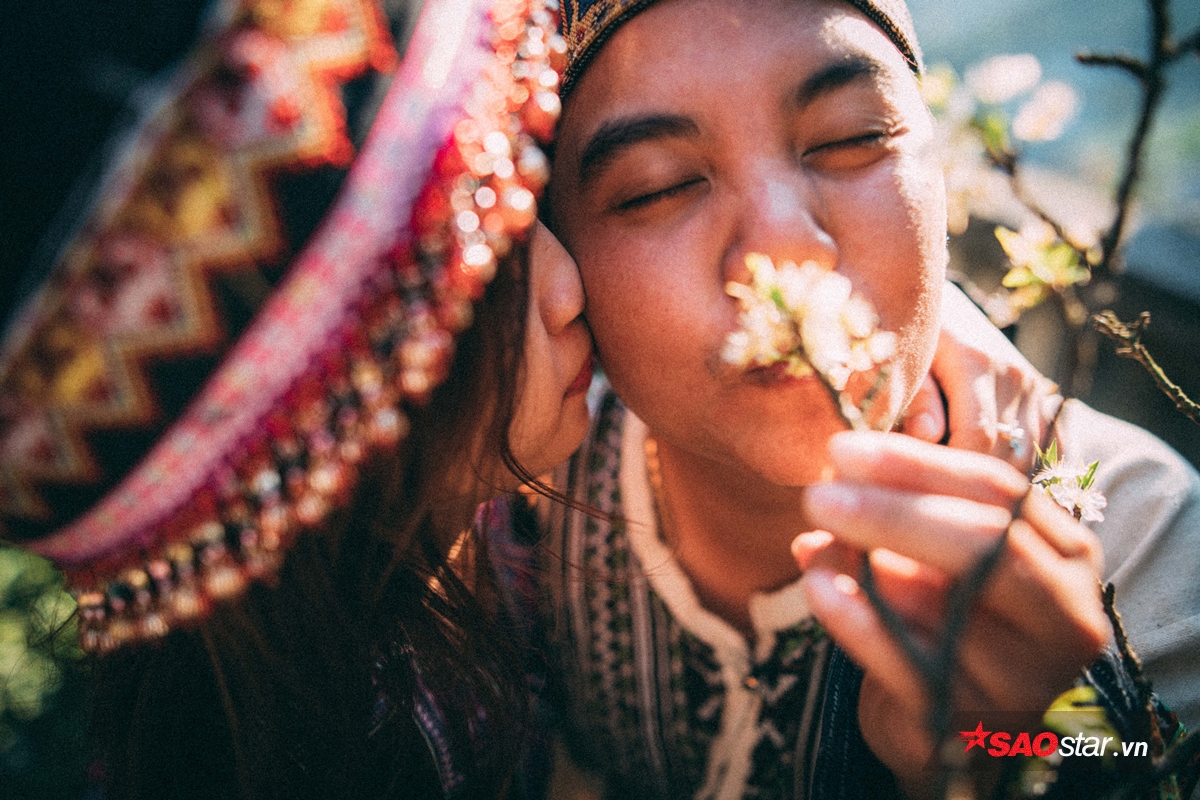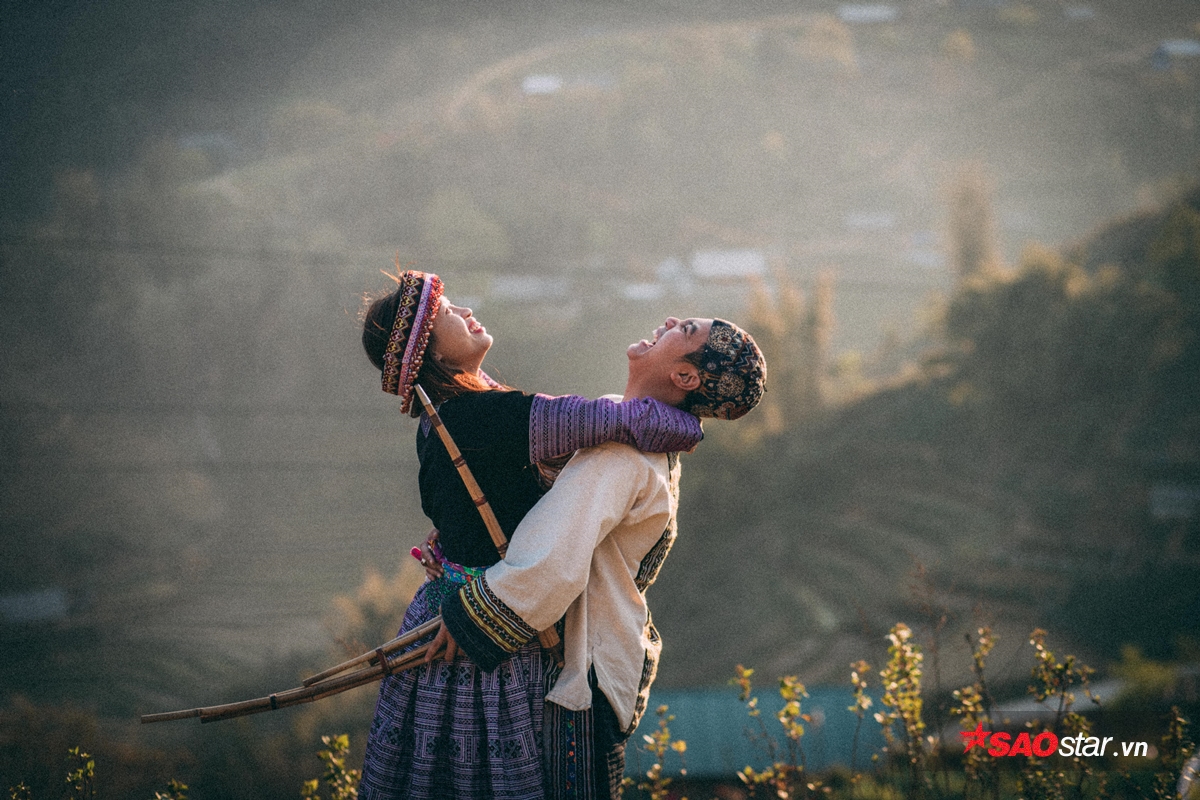 Trong bộ ảnh này, Trường cùng bạn gái hóa thân thành những nam thanh nữ tú người dân tộc. Dưới ánh hoàng hôn đỏ rực ở miền núi, cả 2 trao cho nhau tình cảm nồng ấm với những cử chỉ “tình bể bình”.