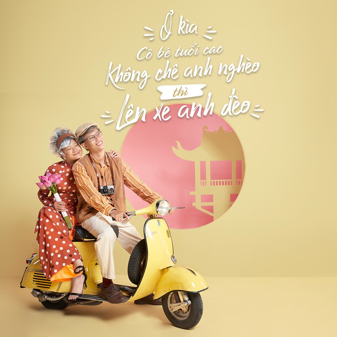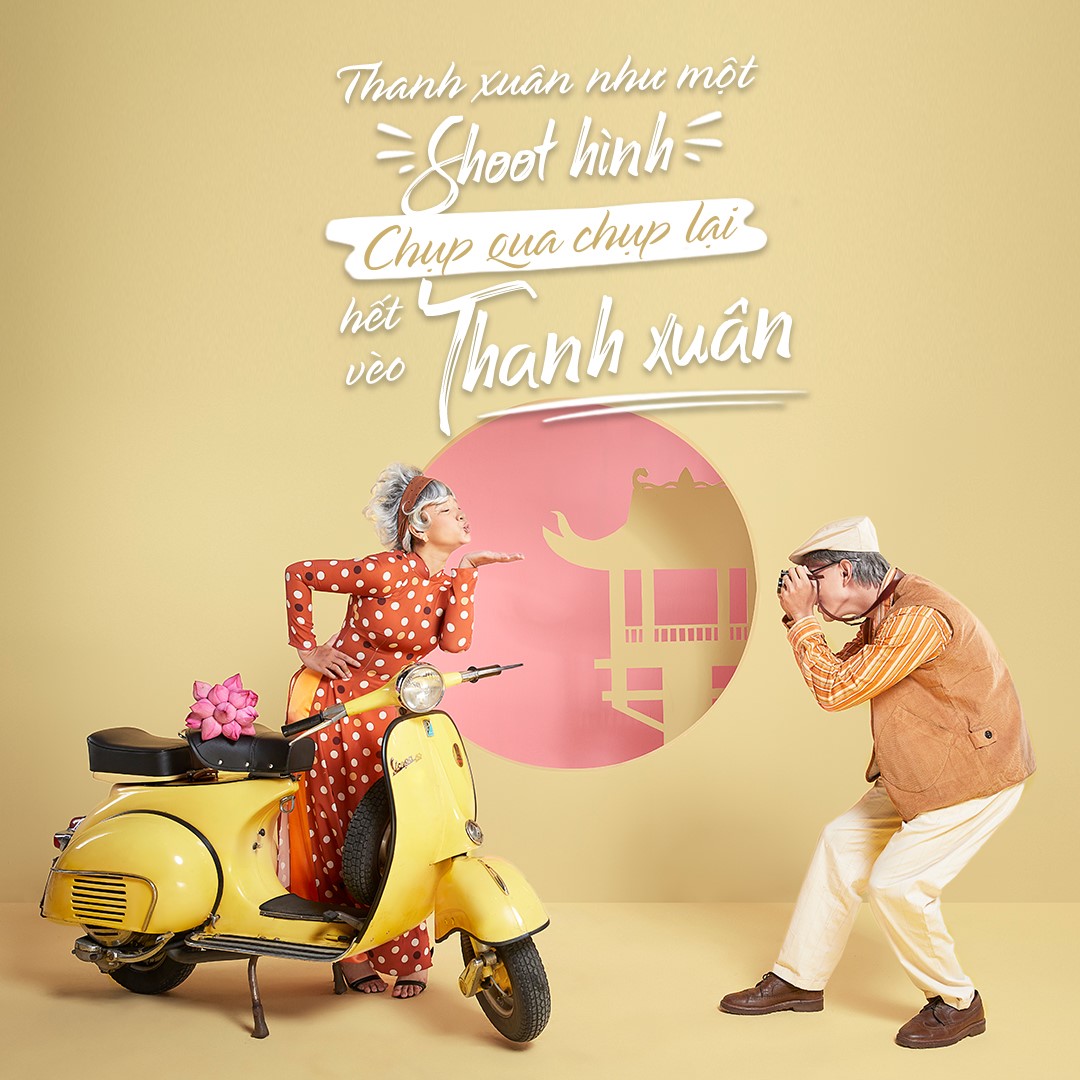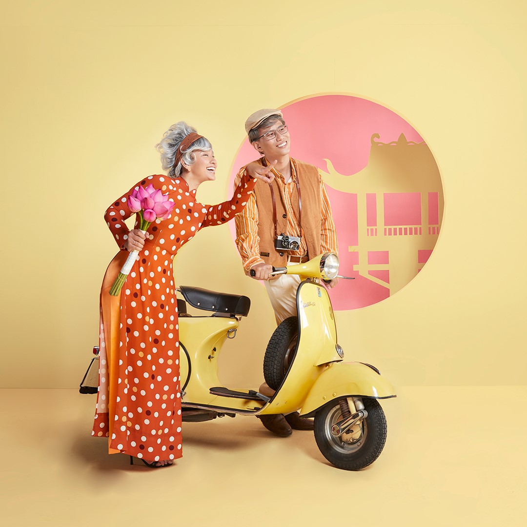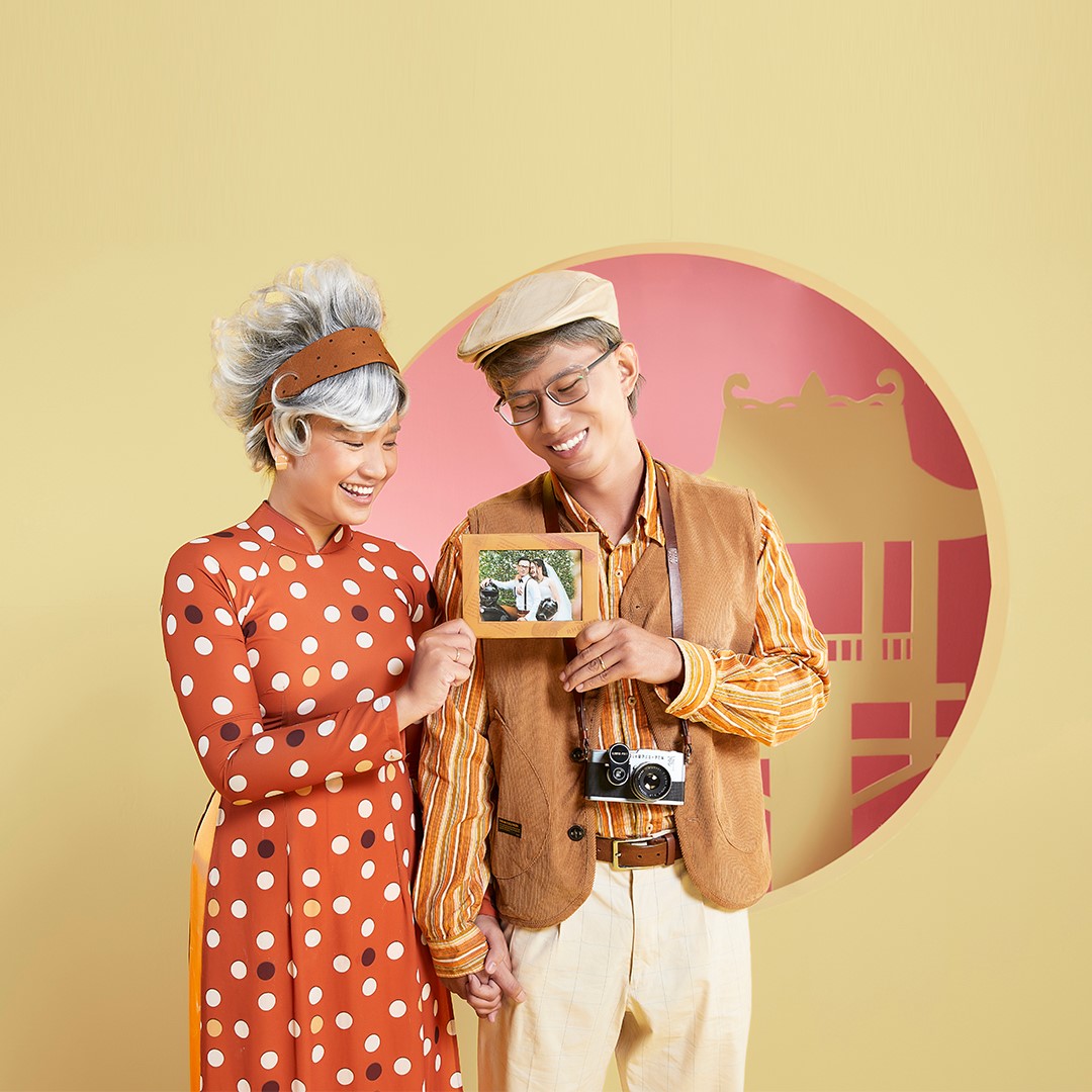 Trong bộ ảnh, Thông - Yến và Minh - Trân đã hóa trang thành chính mình khi về già, và tưởng tượng ra phiên bản “tuổi xế chiều” của mình sẽ hồi xuân như thế nào với áo quần đậm cá tính cùng những khung hình tươi vui.