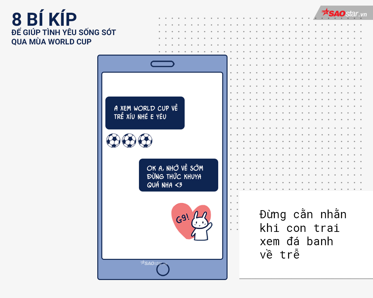 4 năm mới có một lần. Nên không thể tránh được tình trạng chàng về trễ mỗi khi có một trận cầu quan trọng được phát sóng vào buổi đêm. Hãy để chàng tận hưởng trọn vẹn trận đấu nhé. Còn về phía chàng, hãy cẩn thận xe cộ và nhắn tin với bạn gái để họ yên tâm.