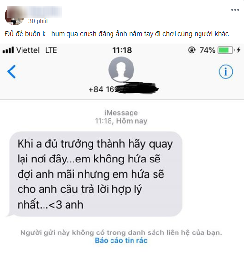 Hôm nay, chủ thớt nhận được tin nhắn với nội dung: “Khi anh đủ trưởng thành hãy quay lại nơi đây, em không hứa sẽ đợi anh mãi nhưng em hứa sẽ cho anh câu trả lời hợp lý nhất”. Điều đáng nói dù tin nhắn với nội dung chia tay nhưng cô nàng giấu mặt được cho là người yêu cũ chủ thớt còn “thả tim”.