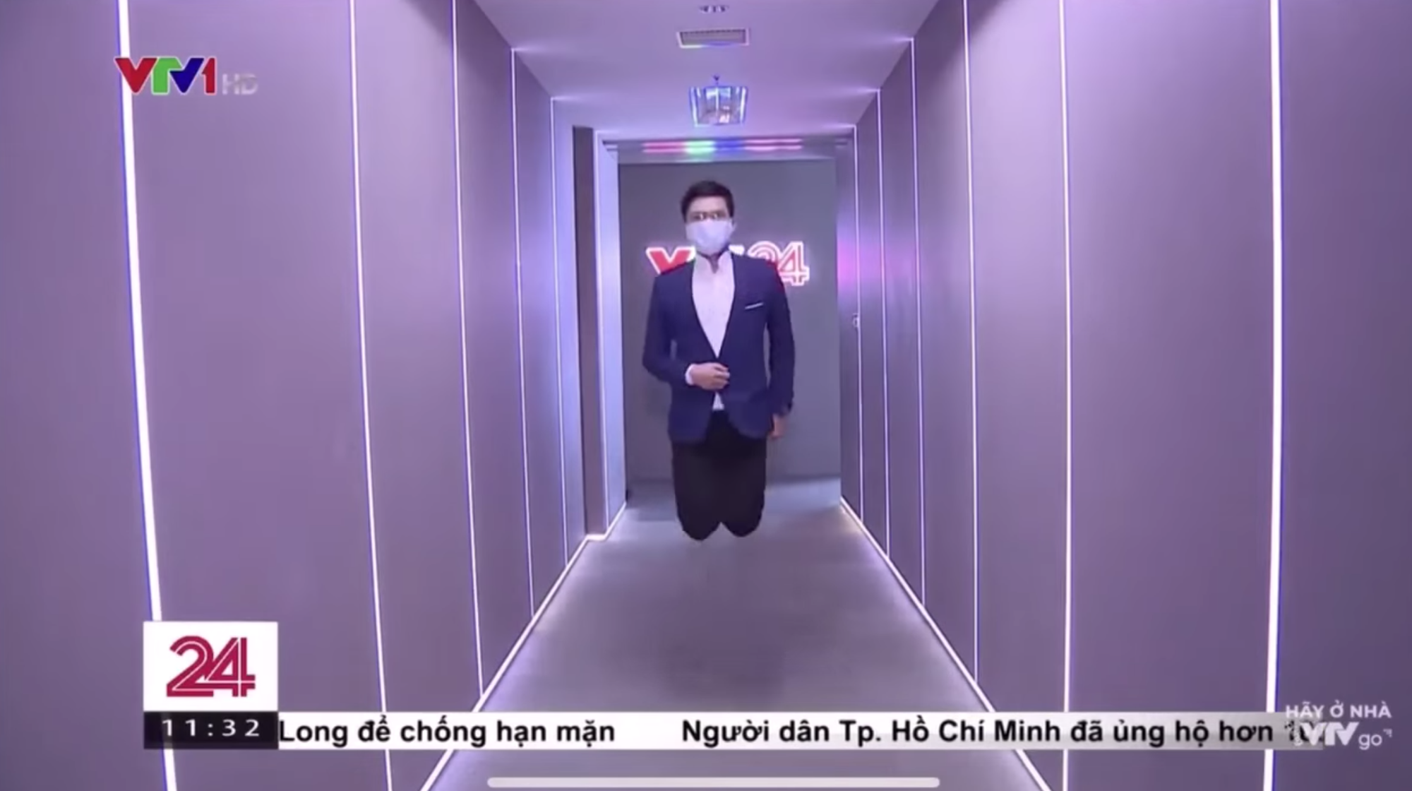 Ngay sau đó, BTV Việt Hoàng còn chủ động đưa ra lời khuyên và thị phạm luôn cách thức giải trí, tập luyện thể dục thể thao bằng việc “đu trend” nhảy trên không, nhảy từ trường quay ra hành lang rồi đến sảnh chính của VTV một cách vô cùng hài hước khiến người xem hết sức ngạc nhiên và cười ra nước mắt.