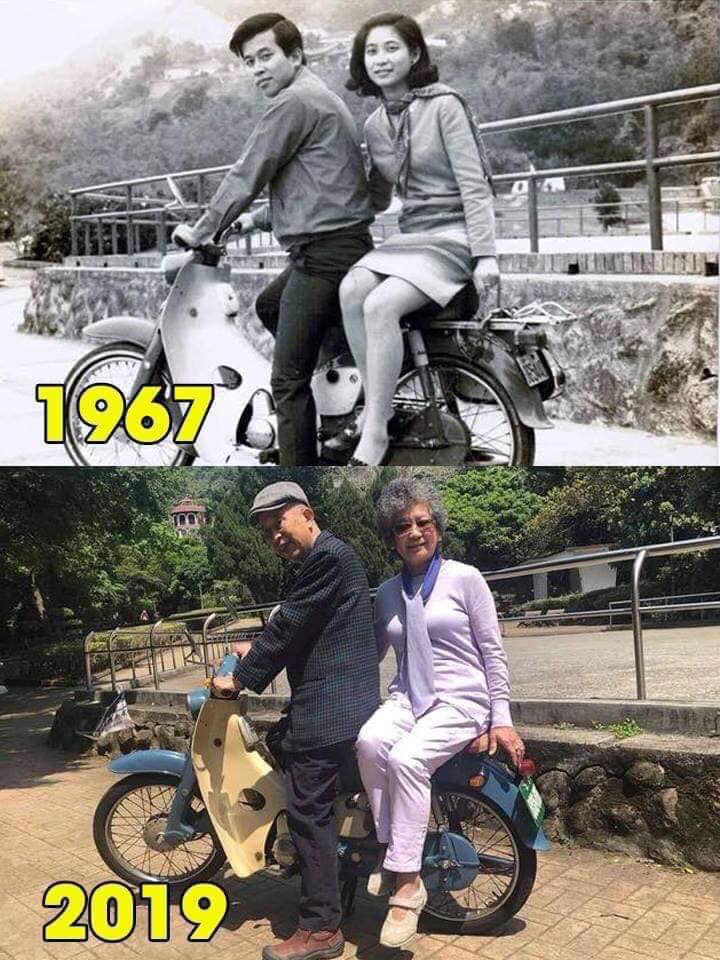 Mới đây cư dân mạng truyền tay nhau bức ảnh so sánh năm 1967 và 2019. Trong ảnh là khung hình giống nhau chỉ có đôi chút khác biệt, vẫn là chiếc xe Honda và đặc biệt là đôi vợ chồng đã bên nhau hơn 50 năm. Ngày ấy họ là những chàng trai, cô gái tài sắc xinh đẹp, cho đến bây giờ khi tuổi tác đã in hằn qua dòng thời gian thì điều đặc biệt nhất là ông bà vẫn thuỷ chung, son sắt và cực tình cảm.