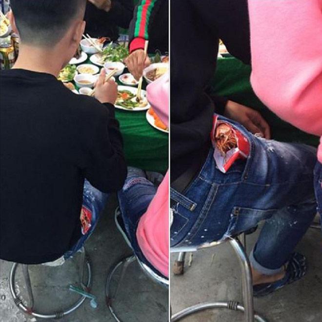 Tuy nhiên, đâu đó vẫn còn những câu chuyện cảm động xoay quanh việc này. Mới đây, dân mạng lại chia sẻ lại bức ảnh người đàn ông đi ăn cỗ nhét vội một con tôm vào túi. Có lẽ ở nơi đó, việc lấy phần không phải là điều được khuyến khích. Thế nên người đàn ông còn cẩn thận bọc con tôm trong giấy ăn rồi mới nhét vội vào túi. Bức ảnh này được một người đứng sau chụp lại khiến không ít dân mạng cảm thấy cay mắt.