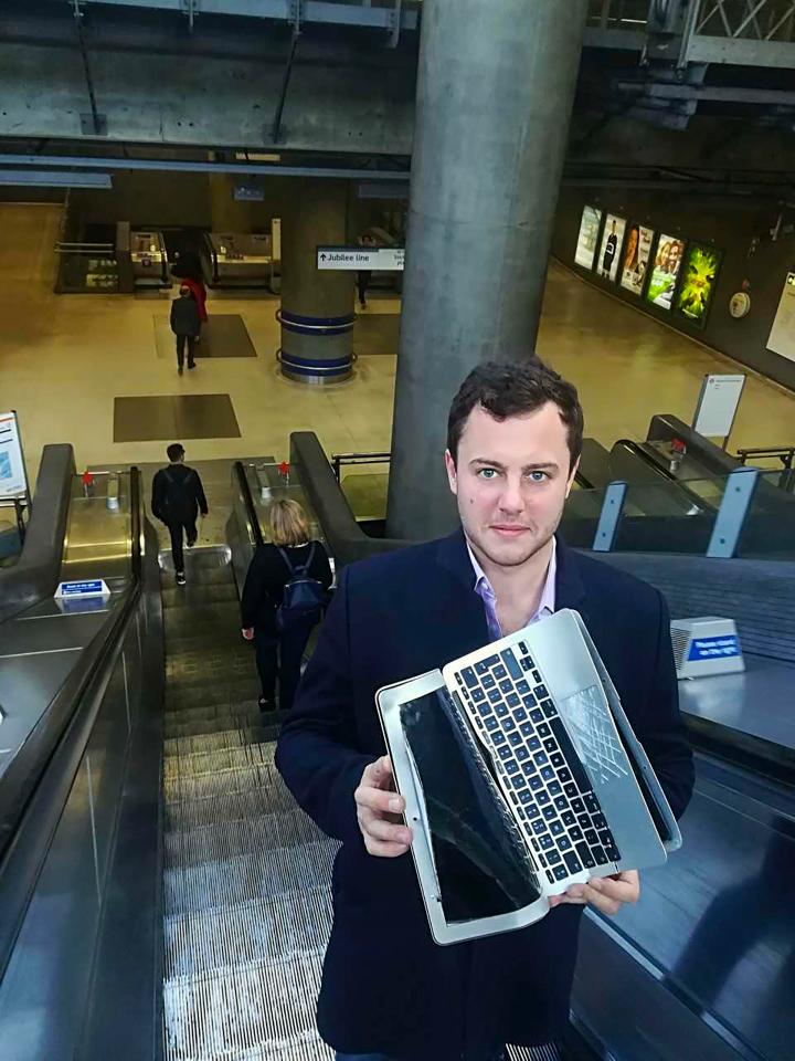 Phillipp Bellessort đặt chiếc túi đựng chiếc Macbook Pro (trị giá khoảng gần 40 triệu đồng) cạnh chân mình khi đi thang cuốn và chiếu túi đã bị trôi vào trong thang, bao gồm cả máy tính.