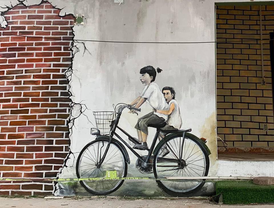 Bức tranh tường tái hiện cảnh hai chị em đèo nhau trên chiếc xe đạp ở Penang (Malaysia) đã quá quen thuộc và nổi tiếng với nhiều người. Trong ảnh, hai em bé có biểu cảm hết sức dễ thương, người em ngồi sau ôm chị cực tình cảm. Ai đến Penang du lịch chắc chắn không thể quên việc chụp ảnh “check in” với bức tranh tường này.