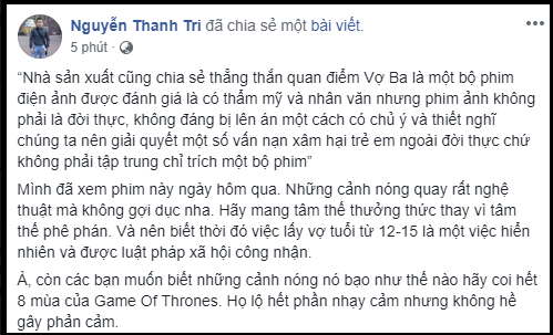 Bên cạnh đó, nhà sản xuất cũng chia sẻ thẳng thắn quan điểm Vợ Ba là một bộ phim điện ảnh được đánh giá là có thẩm mỹ và nhân văn nhưng phim ảnh không phải là đời thực, không đáng bị lên án một cách có chủ ý và thiết nghĩ chúng ta nên giải quyết một số vấn nạn xâm hại trẻ em ngoài đời thực chứ không phải tập trung chỉ trích một bộ phim điện ảnh.