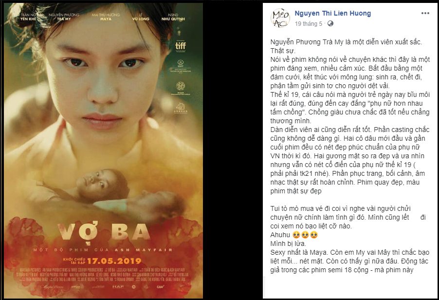 Mình không nói tội ekip hay đạo diễn hay phim, mà tội cô bé Trà My. Ở Việt Nam dễ chết danh, nếu từ đây đến trưởng thành mà em ấy không có vai diễn nào vượt qua Mây trong Vợ ba, thì em sẽ bị giật tít đưa tin với cái tên khó nghe: Cô bé 13 tuổi đóng cảnh nóng. Để rồi đi bất cứ event hay tham gia phim nào cũng sẽ lôi cái danh xưng ấy ra như là một… điểm nhận diện. Khủng khiếp.
